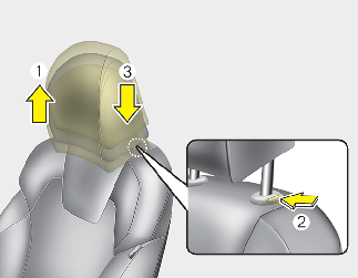 To raise the headrest, pull it up to the desired position (1). To lower the headrest, push and hold the release button (2) and lower the headrest to the desired position (3).