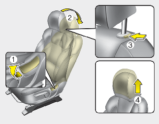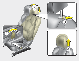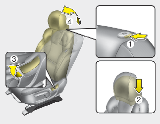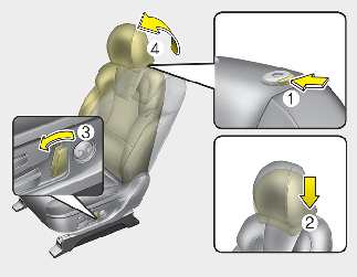 For maximum effectiveness in case of an accident, the headrest should be adjusted so the middle of the headrest is at the same height of the center of gravity of an occupant's head. Generally, the center of gravity of most people's head is similar with the height of the top of their eyes. Also, adjust the headrest as close to your head as possible. For this reason, the use of a cushion that holds the body away from the seatback is not recommended.