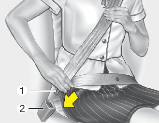 To fasten your seat belt, pull it out of the retractor and insert the metal tab (1) into the buckle (2). There will be an audible "click" when the tab locks into the buckle.