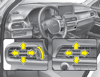 The outlet vents can be opened or closed separately using the thumbwheel or using the vent control lever. Also, you can adjust the direction of air delivery from these vents using the vent control lever as shown.