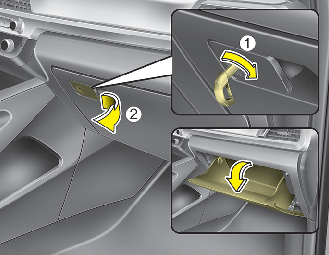 The glove box can be locked and unlocked with the mechanical key (1). To open the glove box, pull the lever (2).