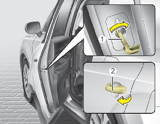 The child safety lock is located on the edge of each rear door. When the child safety lock is in the lock position (1), the rear door will not open if the inner door handle (2) is pulled.