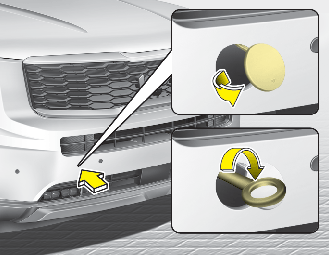 Install the towing hook by turning it clockwise into the hole until it is fully secured.