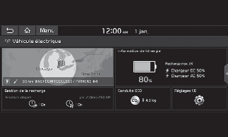 * L'image sur l'écran du menu EV dans ce manuel peut différer de l'écran réel selon les caractéristiques du véhicule et la version du logiciel du système d'infodivertissement. Pour d'autres informations, se reporter au « Guide de référence rapide du système d'infodivertissement de la voiture ».