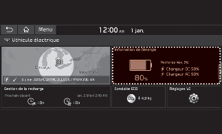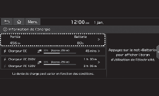Sélectionner « EV → Engergy information (Informations sur l'énergie) → Driving range, battery (Autonomie, batterie) » sur l'écran.