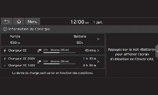 Vous pouvez vérifier la plage accessible, la puissance restante de la batterie et le temps de charge prévu pour chaque type de chargeur.