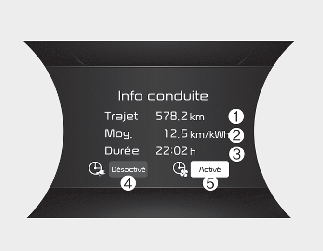 Cet affichage indique la distance du trajet (1), la consommation moyenne d'énergie (2), la durée du trajet (3), l'état du temps de charge (4) et l'état du temps de climatisation (5).