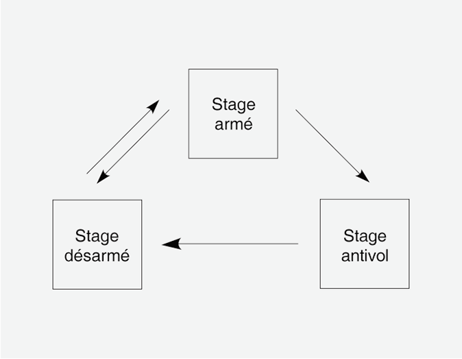 Ce système fonctionne en trois stades : le premier est le stade « Armé », le deuxième est le stade « Alarme antivol » et le troisième, le stade « Désarmé ». S'il se déclenche, le système émet une alarme sonore avec un clignotement des feux de détresse.
