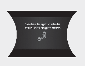 En cas de problème sur le système d’avertissement de collision d’angle mort, un message d’alerte s’affiche et le témoin sur le commutateur s’éteint. La fonction se désactivera automatiquement. L’avertisseur de collision transversale arrière et l’aide à l’évitement des collisions transversales arrière ne fonctionneront pas non plus si l’avertisseur de collision dans l’angle mort s’éteint en raison d’un dysfonctionnement. Faire inspecter votre véhicule par un concessionnaire agréé Kia.