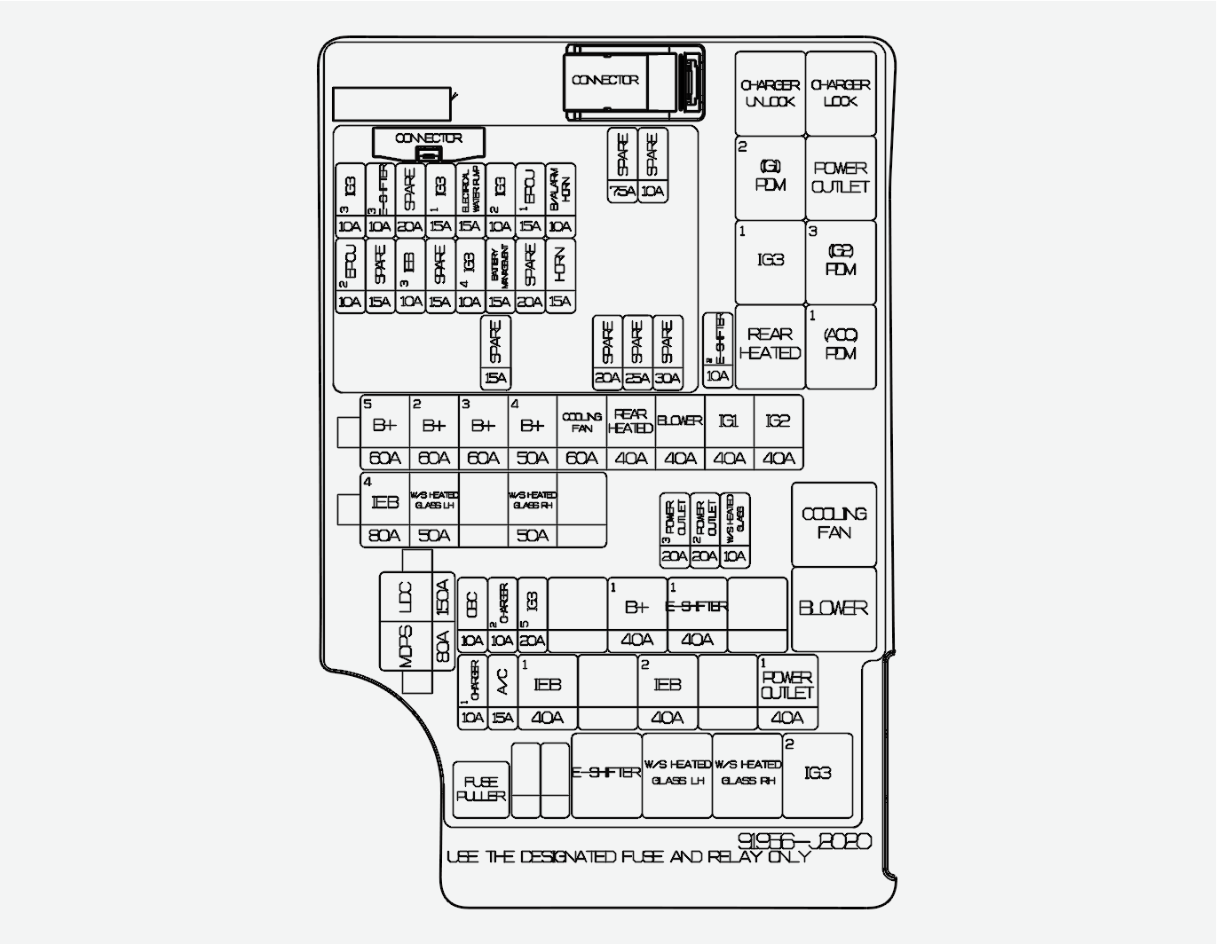 Fusible : PRISE ÉLECTRIQUE 1, IEB1, IEB2, CHARGEUR 1, Climatiseur, EPCU |