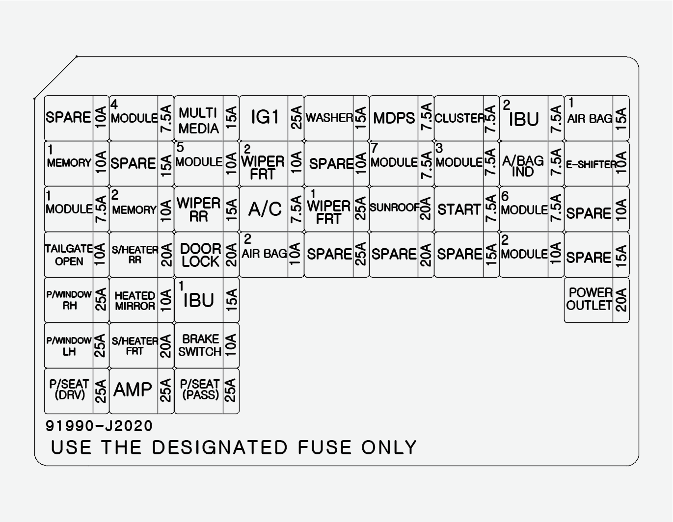 Bloc de jonction ICU (Fusible : HAYON OUVERT, TOIT OUVRANT, Amplificateur, VITRE ÉLECTRIQUE GAUCHE, VITRE ÉLECTRIQUE DROITE, SIÈGE CHAUFFANT AV, SIÈGE ÉLECTRIQUE (PASSAGER), SIÈGE ÉLECTRIQUE (CONDUCTEUR)) |
