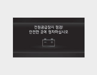 하이브리드 전원 공급 시스템에 고장이 났거나 이상이 있으면 경고문이 표시됩니다. 이 경우 차량을 안전한 곳에 정차한 후 차량을 견인하여 자사 직영 서비스센터나 서비스협력사에서 점검 및 정비를 받으십시오.