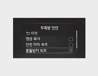 시동 「ON」 상태에서 설정 메뉴의 「운전자 보조→후측방 안전」에서 세부 설정을 통해 각 기능의 사용 여부를 선택하실 수 있습니다.