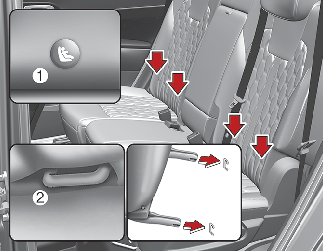 특히 뒷좌석 중앙 좌석은 양 옆의 좌석보다 좁기 때문에 폭이 넓은 어린이 보조 시트를 사용하면 양 옆 좌석의 안전벨트 버클을 가릴 수 있습니다. 이때는 어린이 보조 시트의 위치를 조정하거나 버클 사용이 불가능할 경우 해당 좌석에 탑승하지 마십시오.