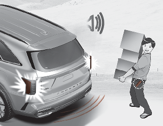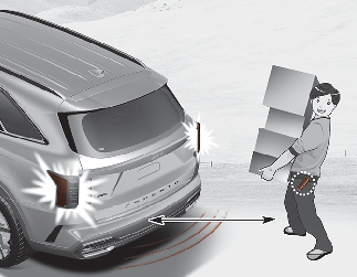 스마트 키를 휴대하고 테일게이트 후방 감지 영역 약 50~100 cm 이내에 접근하면 약 3초간 비상경고등 및 경고음이 작동됩니다.