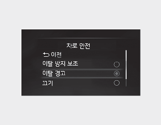 '차로 이탈 경고'를 선택하면 차로를 이탈할 경우 경고음이 울립니다. 조향을 도와주지 않으므로 운전자가 직접 스티어링 휠을 조작해야 합니다.