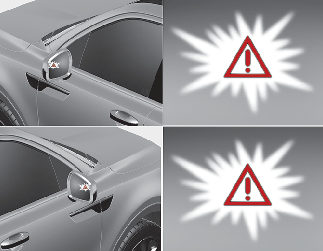 실외 미러 경고등이 깜빡이고 계기판에 경고문이 표시됩니다. 또한 헤드업 디스플레이(사양 적용 시)에 경고등이 깜빡이고 동시에 경고음이 울려 운전자에게 알립니다.