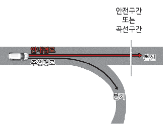 안내 경로(본선 유지)와 주행 경로(분기선 이탈)의 차이가 발생할 경우 전용도로 본선의 안전구간 또는 곡선구간 정보에 의해 고속도로 안전구간 자동감속 또는 고속도로 곡선구간 자동감속 기능이 일시적으로 작동될 수 있습니다.