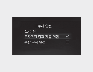시동 「ON」 상태에서 설정 메뉴의 ‘운전자 보조 → 주차 안전 → 후방 교차 안전’을 선택하면 기능이 켜집니다. 기능을 끄고 싶으면 선택을 해제해야 합니다.