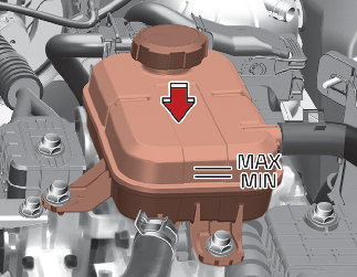 전기(동력) 장치 냉각수는 항상 높은 압력으로 유지됩니다. 전기(동력) 장치 냉각수의 양은 매일 점검하여 필요할 때 보충하십시오. 전기(동력) 장치 냉각수의 양은 엔진이 차가울 때 보조탱크 옆면에 표시되어 있는 최대선(MAX)과 최소선(MIN) 사이에 있어야 합니다. 최소선(MIN)에 가까우면 지정된 사양에 맞는 부동액을 냉각수 혼합 비율에 맞추어 최대선(MAX)까지 채우고 최대선(MAX)을 넘지 않도록 보충하십시오.