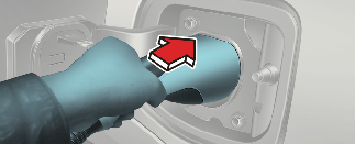 เปิดฝาช่องเสียบชาร์จโดยกดบริเวณเครื่องหมายวงกลมที่ขอบด้านขวาของฝา หากประตูรถล็อก ฝาช่องเสียบชาร์จจะไม่เปิดออก