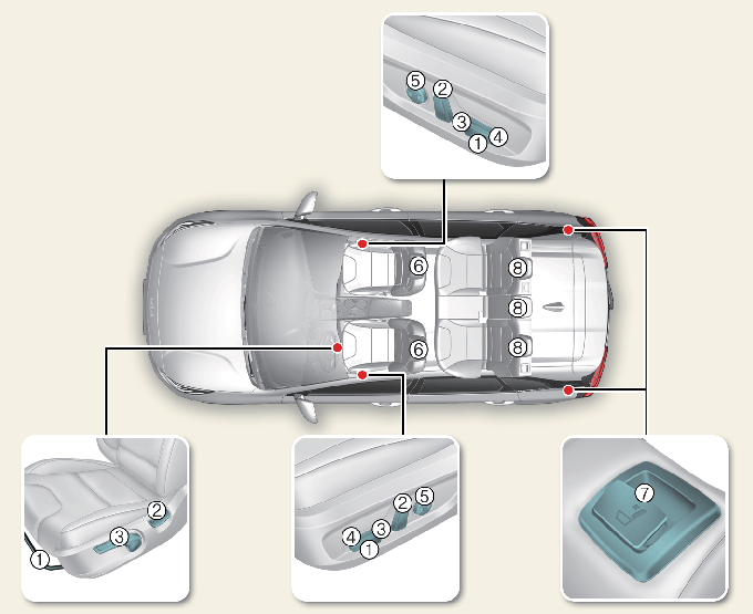 * รูปนี้อ้างอิงจากรถพวงมาลัยซ้าย สำหรับรถพวงมาลัยขวา การทำงานของที่นั่งด้านหน้าจะอยู่ในด้านตรงข้าม