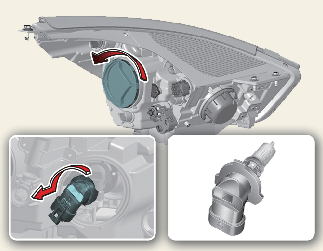 ถอดซ็อกเก็ตหลอดไฟออกจากชุดประกอบไฟหน้าด้วยการหมุนซ็อกเก็ตทวนเข็มนาฬิกาจนกว่าแถบบนซ็อกเก็ตตรงกับช่องบนชุดประกอบไฟหน้า