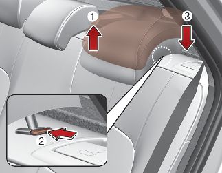 Če želite dvigniti naslon za glavo, ga povlecite v želeni položaj (1). Če želite spustiti naslon za glavo, pritisnite in držite gumb (2) na podpori naslona za glavo ter ga spustite v želeni položaj (3).