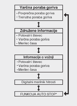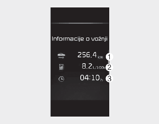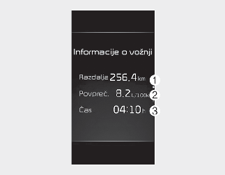 Ta zaslon prikazuje razdaljo potovanja (1), povprečno učinkovitost goriva (2) in informacije o skupnem času vožnje (3) glede na en cikel vžiga.