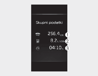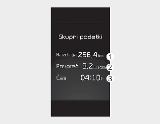 Ta zaslon prikazuje združeno razdaljo potovanja (1), povprečno učinkovitost goriva (2) in skupni čas vožnje (3).
