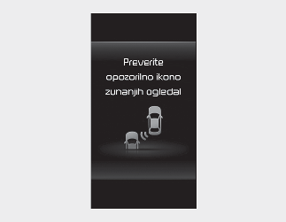 Če opozorilna lučka zunanjega vzvratnega ogledala ne deluje pravilno, se na instrumentni plošči prikaže opozorilo ’Check side view mirror warning light’ (Preverite opozorilno lučko zunanjega vzvratnega ogledala). Priporočamo, da vaše vozilo pregleda pooblaščeni serviser/storitveni partner za vozila Kia.