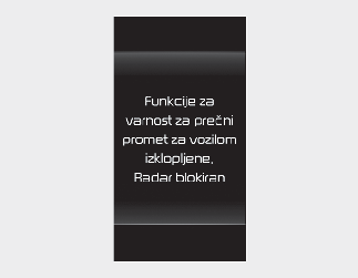 V tem primeru se na armaturni plošči prikaže opozorilno sporočilo »Rear Cross-Traffic Safety disabled. Radar blocked« (Varnostni sistem za možnost trčenj pri prečnem prometu zadaj onemogočen. Radar blokiran).
