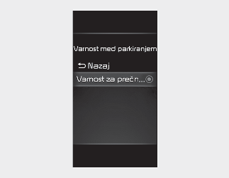 Ko sta stikalo za vžig ali gumb ENGINE START/STOP (Zagon/ustavitev motorja) v položaju »ON« (Vklop), v meniju »Settings« (Nastavitve) izberite »Driver Assistance« (Pomoč vozniku) → »Parking Safety« (Varnost parkiranja) → »Rear Cross-Traffic Safety« (Varnost pri možnosti trčenj pri prečnem prometu zadaj), da vklopite sistem varnosti pri možnosti trčenj pri prečnem prometu zadaj ali funkcijo prekličete.