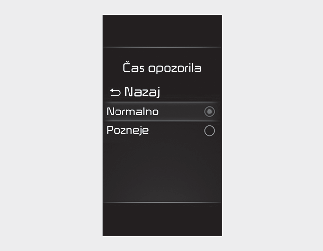Ob dostavi vozila je čas opozorila nastavljen na način NORMAL (običajni). Če spremenite čas opozorila, se lahko čas opozorila pri drugih sistemih pomoči vozniku spremeni.