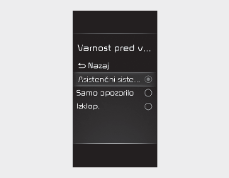 Voznik lahko v meniju »Settings« (Nastavitve) nadzira stanje vklopa/izklopa sistema za preprečevanje čelnega trčenja. Če