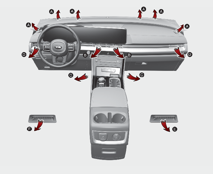 O caudal de ar é dirigido maioritariamente para o chão, com uma pequena quantidade a ser dirigida para o para-brisas, desembaciadores dos vidros laterais e entradas de ar laterais.
