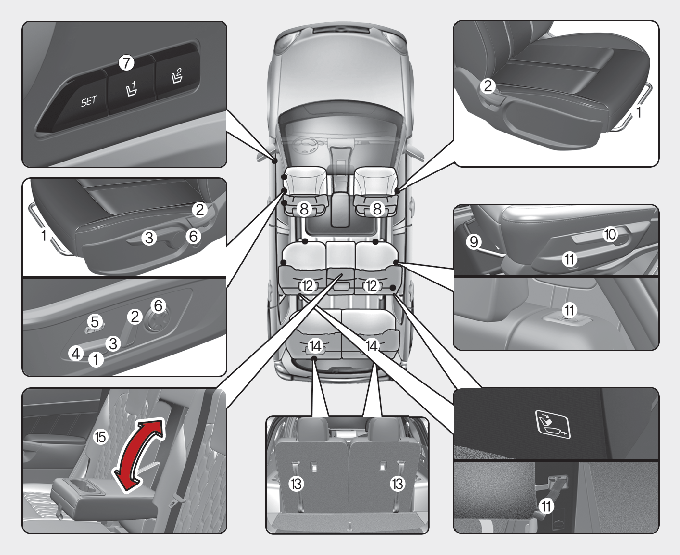 * There is no bench seat on rear 2nd-row with vehicle equipped with 6 seating positions.