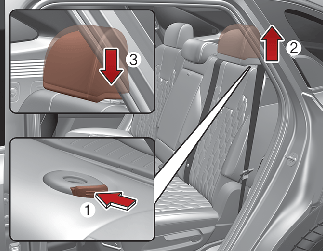 To raise the headrest, pull it up to the desired position (1). To lower the headrest, push and hold the release button (3) on the headrest support and lower the headrest to the desired position (2).