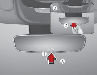 Pull the day/night lever toward you (2) to reduce the glare from the headlamps of the vehicles behind you during night driving.