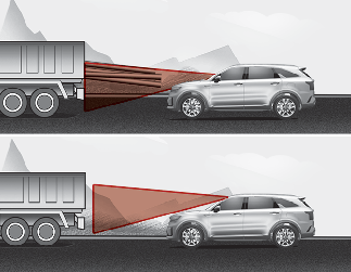 If the vehicle in front of you has cargo that extends rearward from the cab, or when the vehicle in front of you has higher ground clearance, additional special attention is required. Forward Collision-Avoidance Assist may not be able to detect the cargo extending from the vehicle. In these instances, you must maintain a safe braking distance from the rearmost object, and if necessary, steer your vehicle and depress the brake pedal to reduce your driving speed in order to maintain distance.