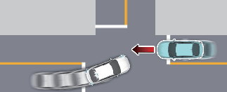 Функция предупреждения при повороте на перекрестке применяет экстренное торможение, чтобы избежать столкновения со встречным автомобилем, моторизованным двухколесным транспортным средством или велосипедистом на соседней полосе при повороте на перекрестке налево (левый руль) или направо (правый руль) с включенным сигналом поворота.