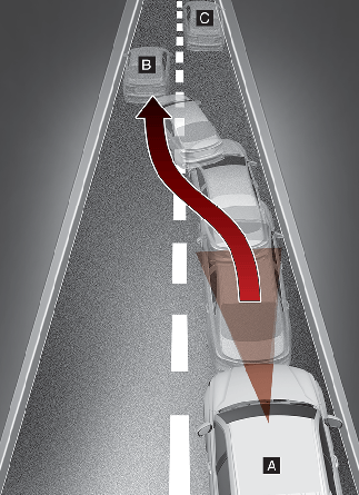 Если впереди идущий автомобиль или электросамокат (B) перестраивается, система помощи по предотвращению лобового столкновения может не сразу определить автомобиль или электросамокат (C), который находится перед вами. В этом случае необходимо поддерживать безопасную дистанцию торможения и при необходимости управлять автомобилем и нажимать на педаль тормоза для снижения скорости движения с целью поддержания безопасной дистанции.