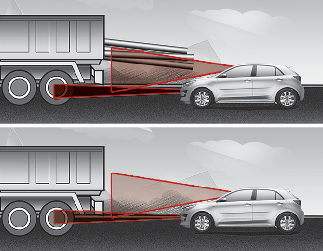 Если впереди идущий автомобиль имеет груз, выступающий сзади за пределы автомобиля, или если автомобиль имеет высокий дорожный просвет, соблюдайте особую осторожность. Система предотвращения лобового столкновения может не обнаружить груз, выходящий за габариты транспортного средства. В этих случаях необходимо поддерживать безопасную дистанцию торможения от крайнего объекта и при необходимости управлять автомобилем и нажимать на педаль тормоза для снижения скорости движения с целью поддержания требуемой дистанции.