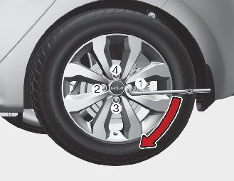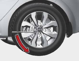 Затем расположите ключ, как показано на рисунке, и затяните гайки колеса. Следите за тем, чтобы головка ключа полностью сидела на гайке. Не становитесь на рукоять ключа ногами и не надевайте на нее удлинительную трубу. Затягивать гайки колеса нужно по окружности, через одну, пока они все не будут затянуты. После этого необходимо проверить затяжку каждой гайки. После смены колес следует проверить систему в специализированной мастерской. Kia рекомендует обратиться к официальному дилеру Kia или партнерской сервисной компании.