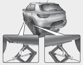 Установите домкрат в переднее (1) или заднее (2) подъемное положение (ближайшее к заменяемому колесу). Разместите домкрат под рамой автомобиля в обозначенной точке. Положения для упора домкрата — это приваренные к раме автомобиля пластины с двумя фиксаторами и наплывом.