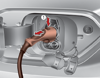 Ако заключването на конектора за зареждане не се отключи дори след освобождаване на ключалката на вратата, използвайте лоста за аварийно освобождаване в моторното отделение и натиснете бутона за отключване на конектора за зареждане (1), за да изключите конектора за зареждане. Ако това се случи, функцията за заключване на конектора за зареждане може да е дефектна и Kia препоръчва автомобилът да се провери от оторизиран представител/сервизен партньор на Kia.