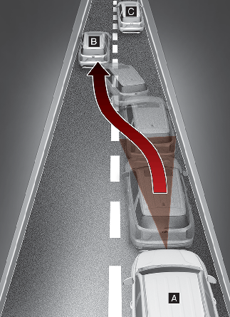 Quando um veículo se move para a sua faixa de uma faixa adjacente não pode ser detetado pelo sensor até que esteja no alcance de deteção do sensor. A Assistência à prevenção de colisão frontal pode não detetar imediatamente o veículo quando este muda de faixa abruptamente. Neste caso, deverá manter uma distância de travagem segura e, caso seja necessário, manobrar o veículo e pressione o pedal do travão para reduzir a sua velocidade de condução, de forma a manter uma distância segura.