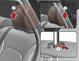 To lower the headrest, push and hold the release button (2) on the headrest support and lower the headrest to the desired position (3).