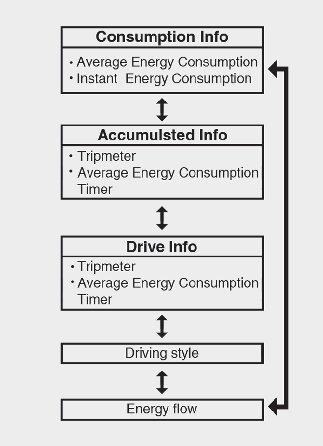 The electric vehicle system informs the driver its energy flow in various operating modes. While driving, the current energy flow is specified in 3 modes.