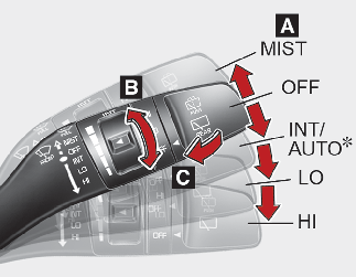 MIST: For a single wiping cycle, move the lever to this (MIST) position and release it. The wipers will operate continuously if the lever is held in this position.